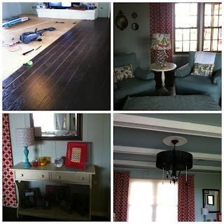 The black chandelier, red pendant lights and white furniture covers are all from Overstock.com The table lamps are all from Target.